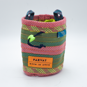Sacca porta magnesite realizzata artigianalmente con corde d'arrampicata riciclate, il fondo è stato cucito a maglia utilizzando le anime delle stesse corde. Mentre la parte interna è ricavata da tele di vecchi ombrelli.