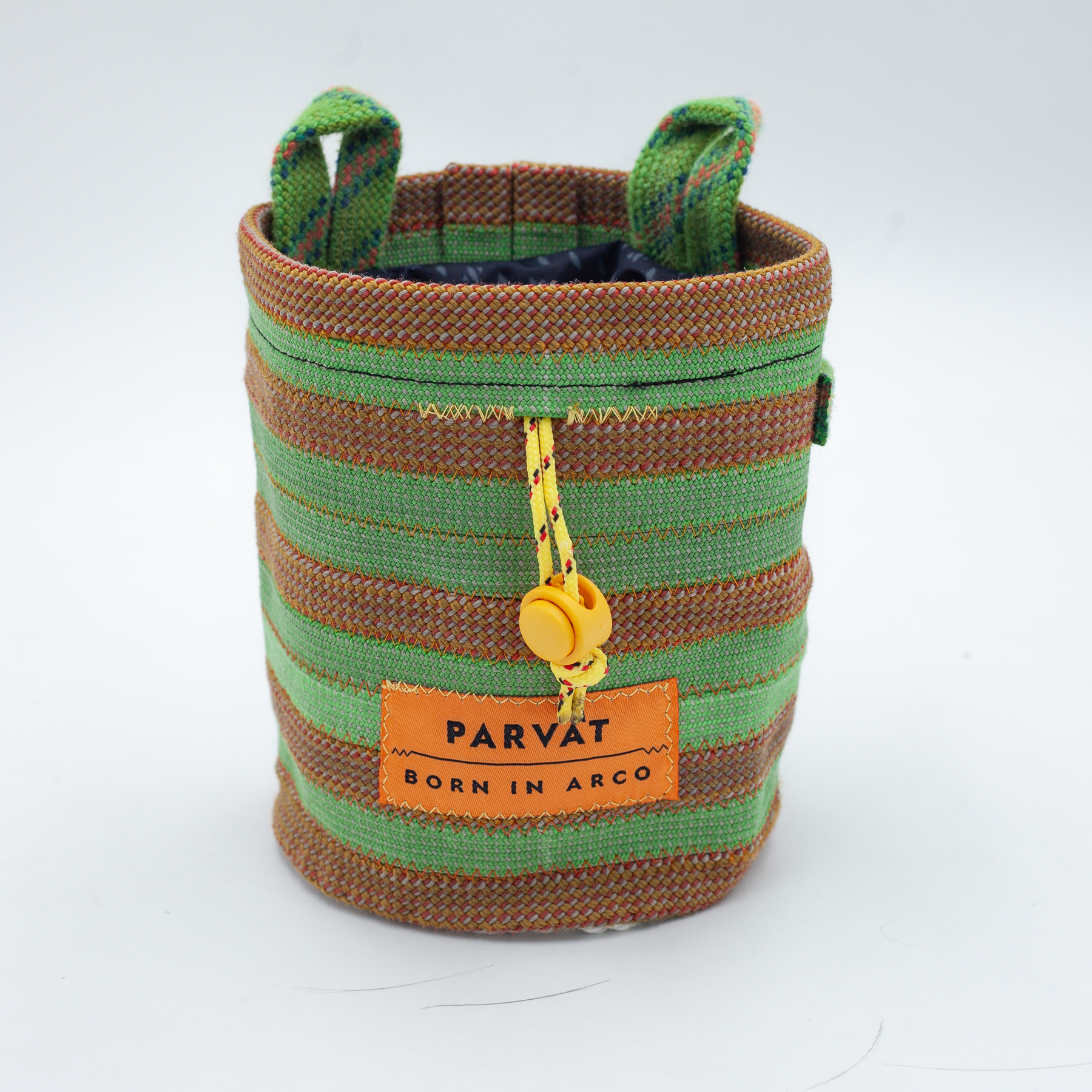 Sacca porta magnesite realizzata artigianalmente con corde d'arrampicata riciclate, il fondo è stato cucito a maglia utilizzando le anime delle stesse corde. Mentre la parte interna è ricavata da tele di vecchi ombrelli.