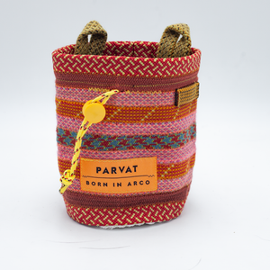Sacca porta magnesite realizzata artigianalmente con corde d'arrampicata riciclate, il fondo è stato cucito a maglia utilizzando le anime delle stesse corde. Mentre la parte interna è ricavata da tele di vecchi ombrelli