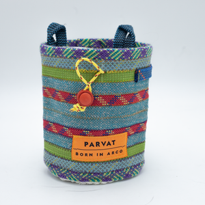 Sacca porta magnesite realizzata artigianalmente con corde d'arrampicata riciclate, il fondo è stato cucito a maglia utilizzando le anime delle stesse corde. Mentre la parte interna è ricavata da tele di vecchi ombrelli.