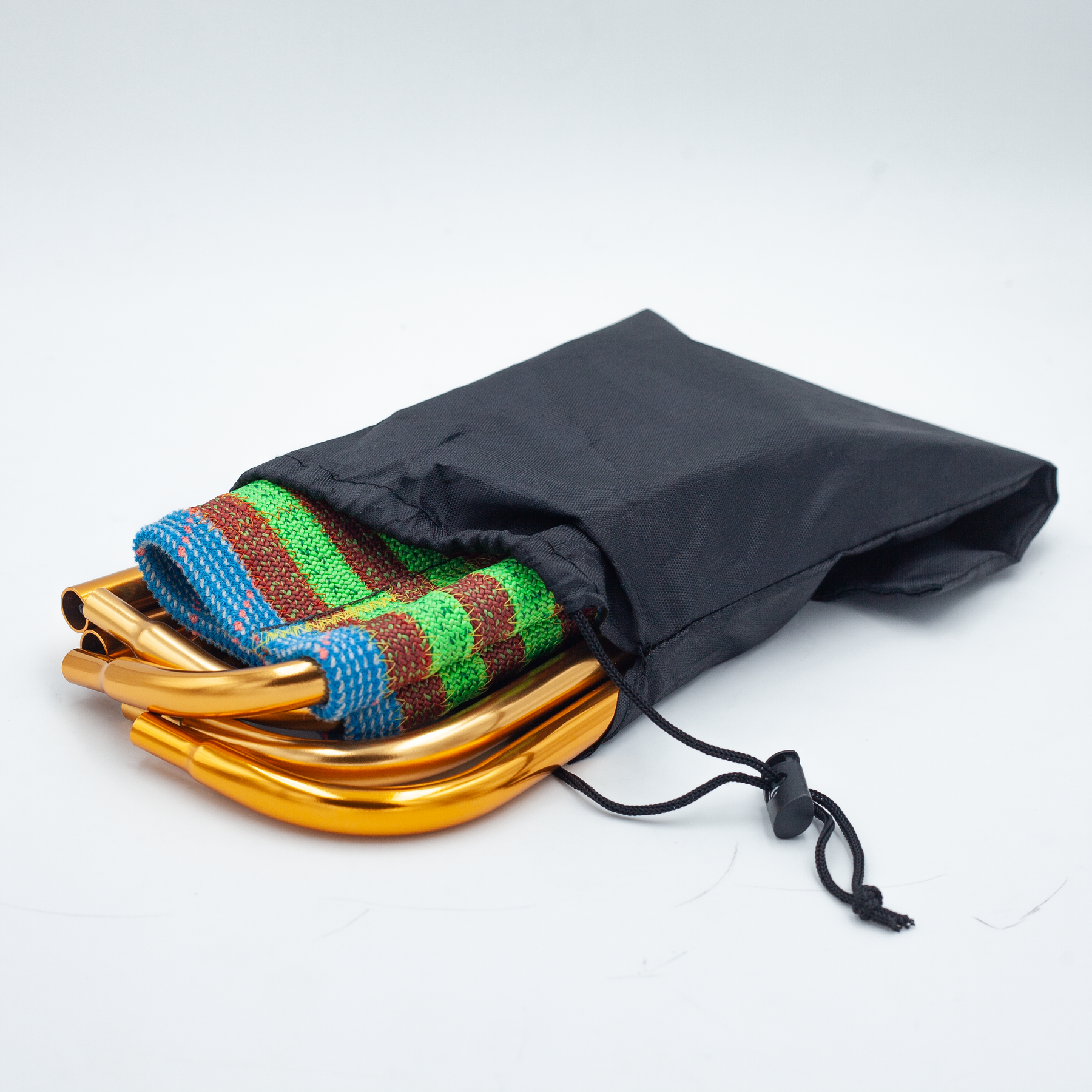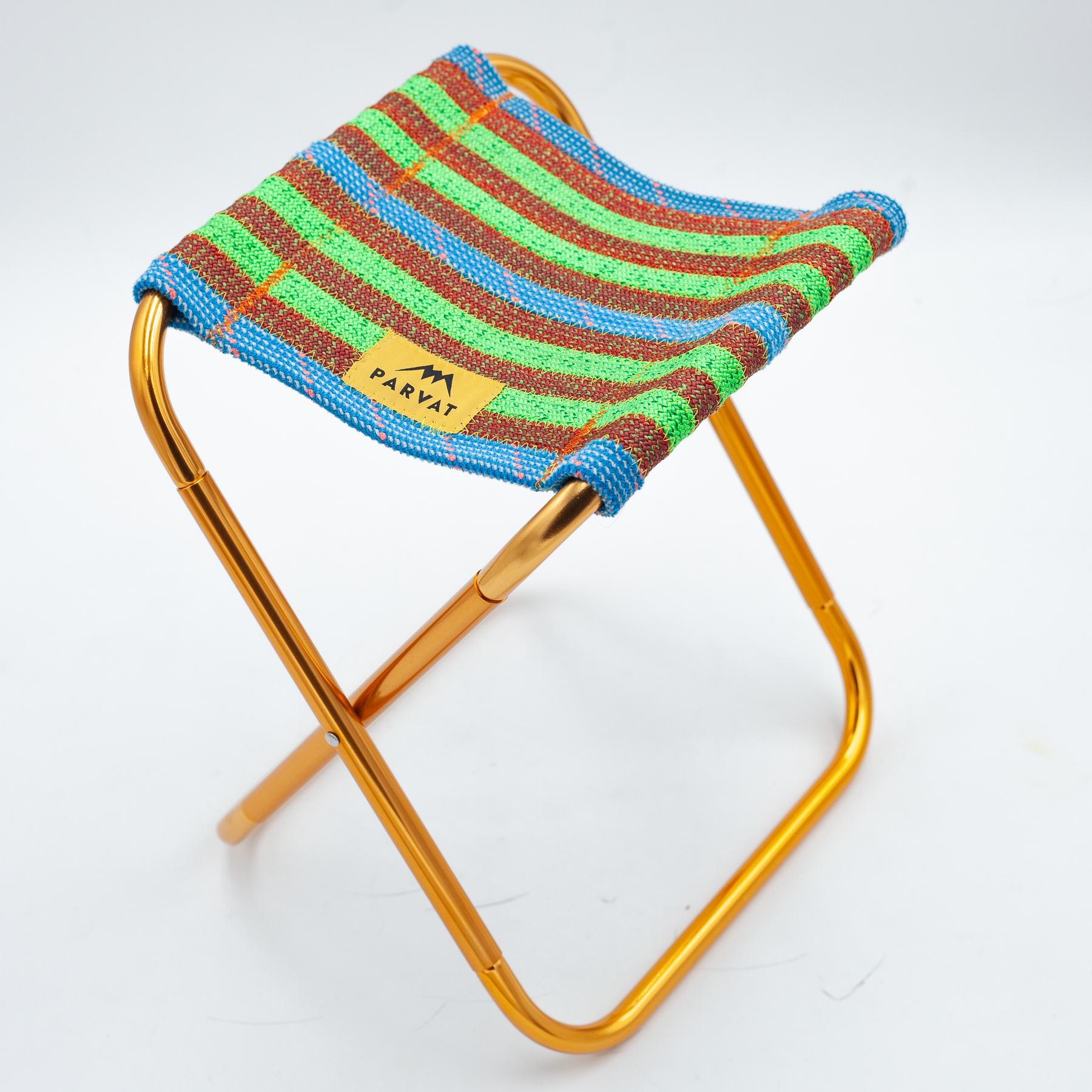 Sgabello pieghevole in alluminio con elastico interno. Seduta realizzata artigianalmente in corde d’arrampicata riciclate. Include pratica borsetta per il trasporto.