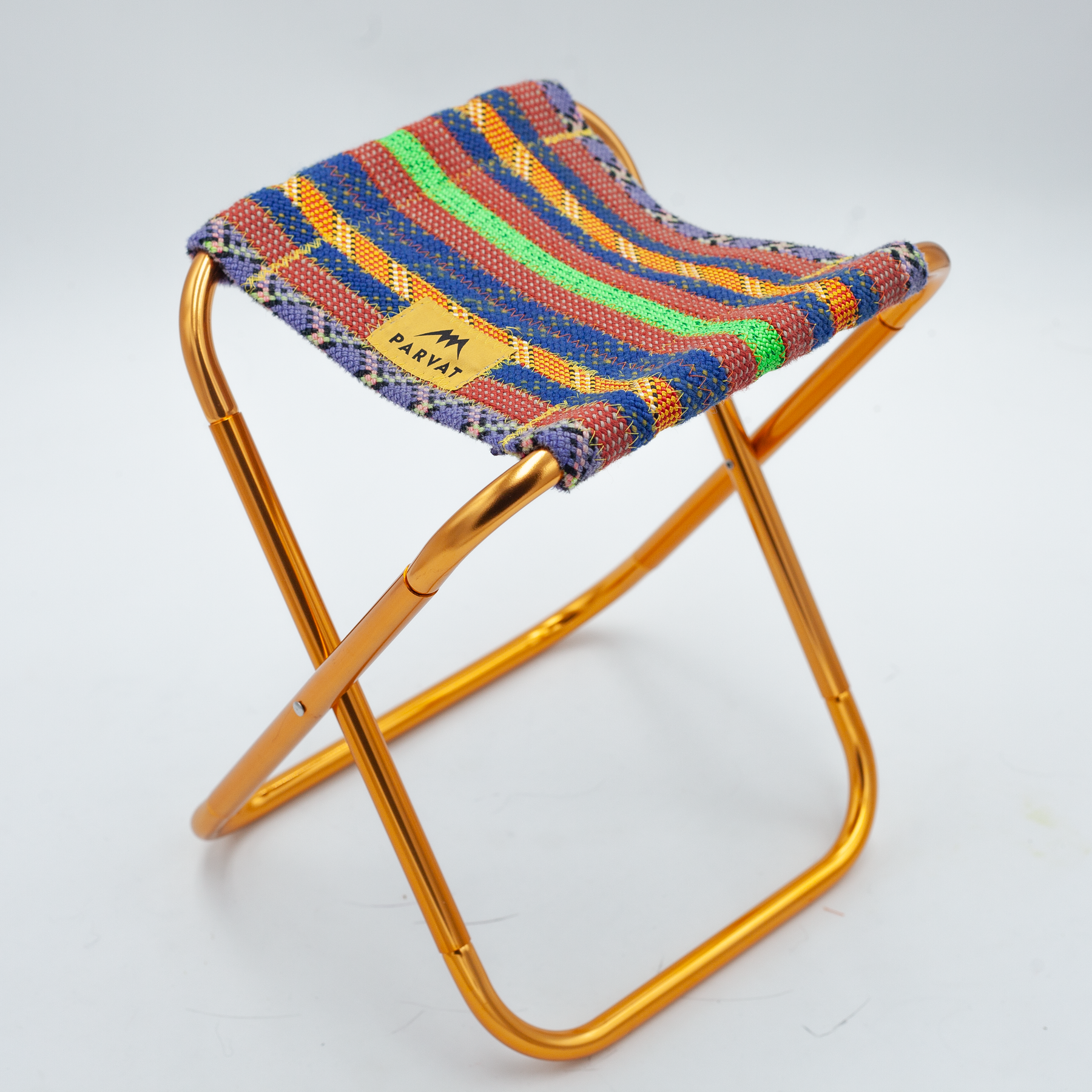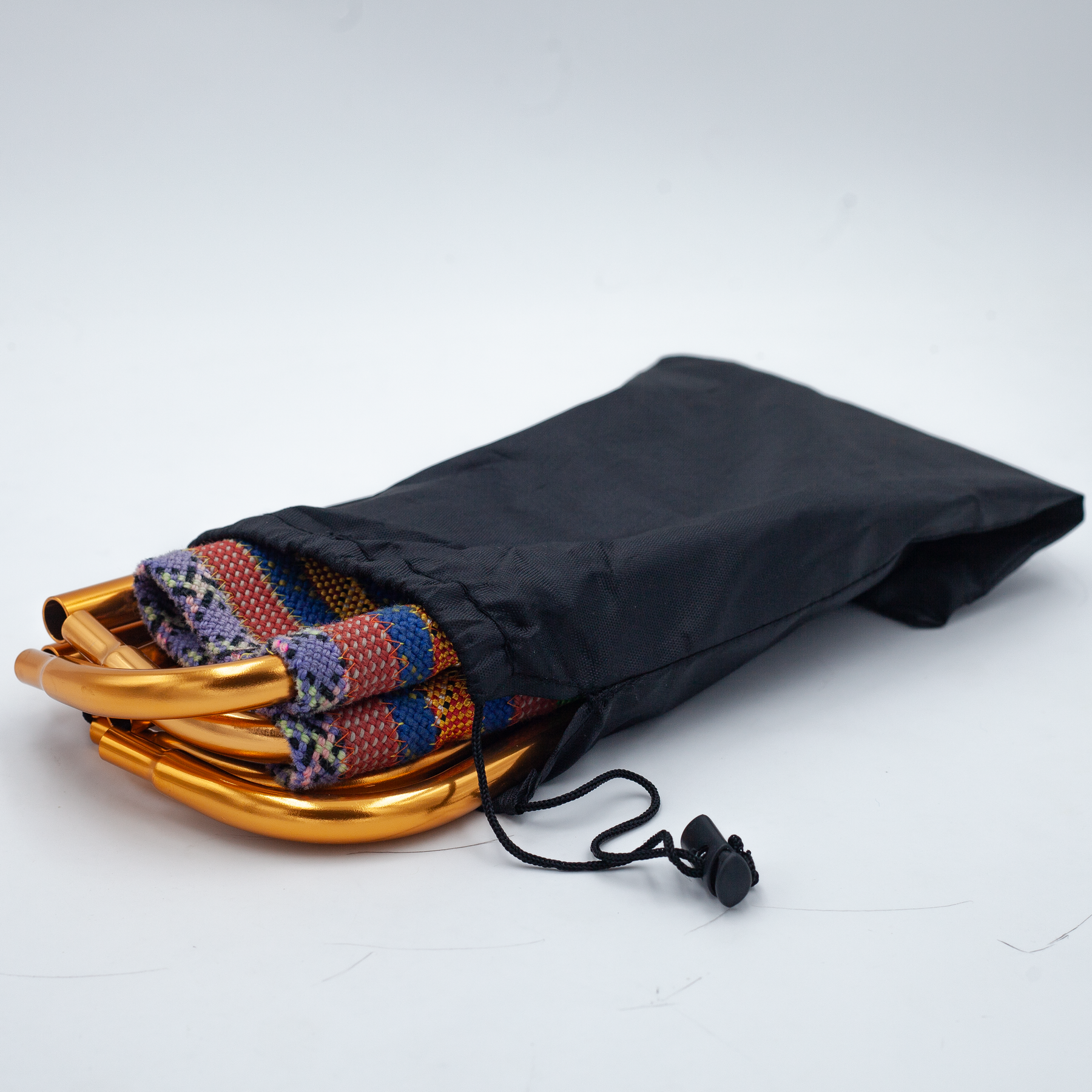 Sgabello pieghevole in alluminio con elastico interno. Seduta realizzata artigianalmente in corde d’arrampicata riciclate. Include pratica borsetta per il trasporto.