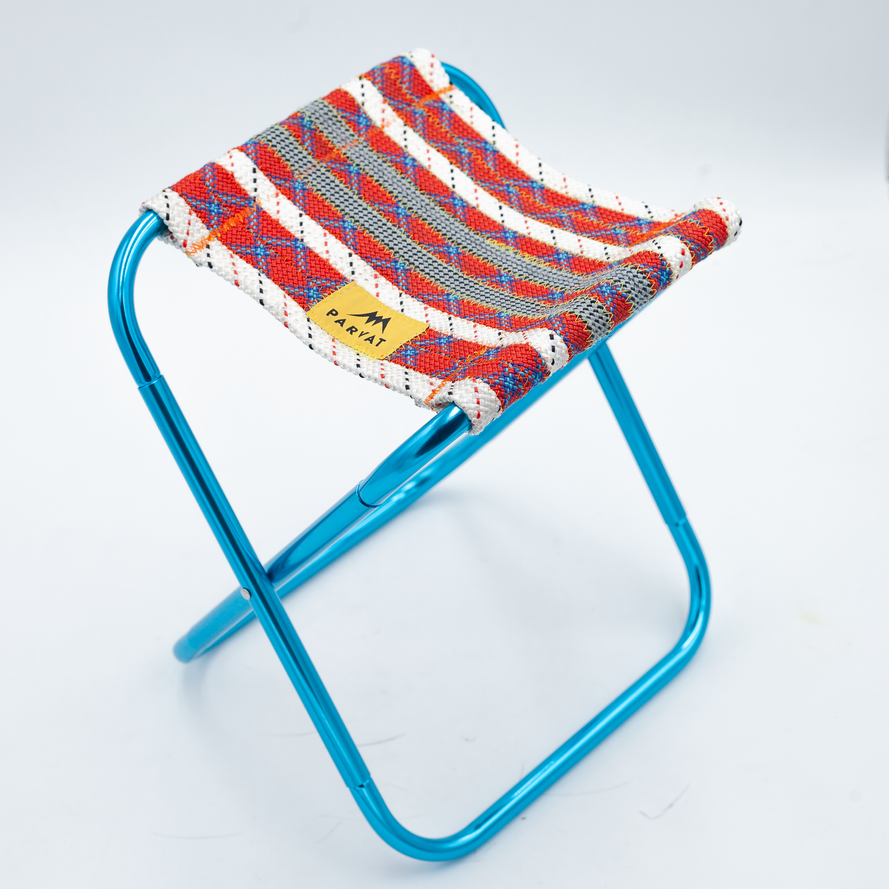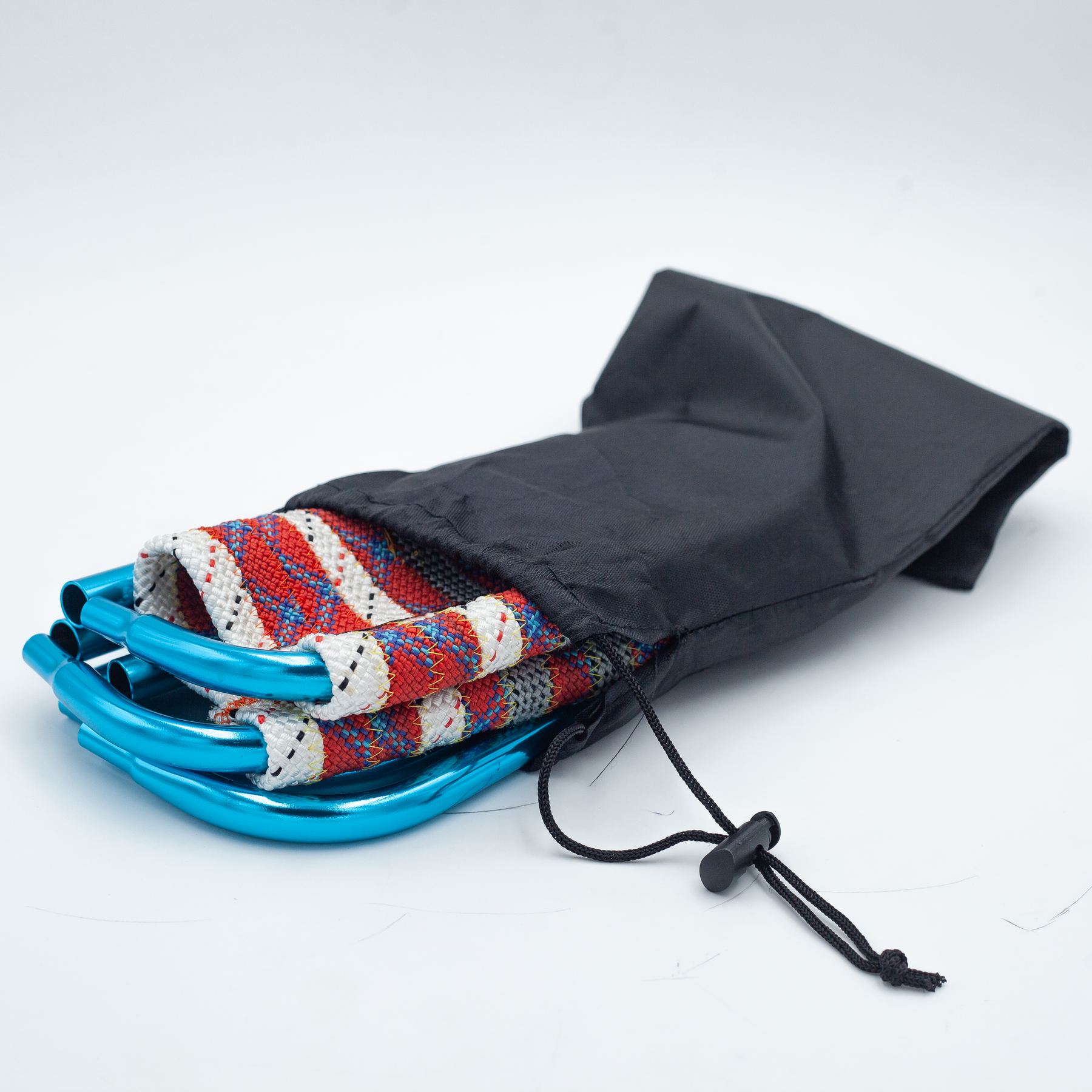 Sgabello pieghevole in alluminio con elastico interno. Seduta realizzata artigianalmente in corde d’arrampicata riciclate. Include pratica borsetta per il trasporto.