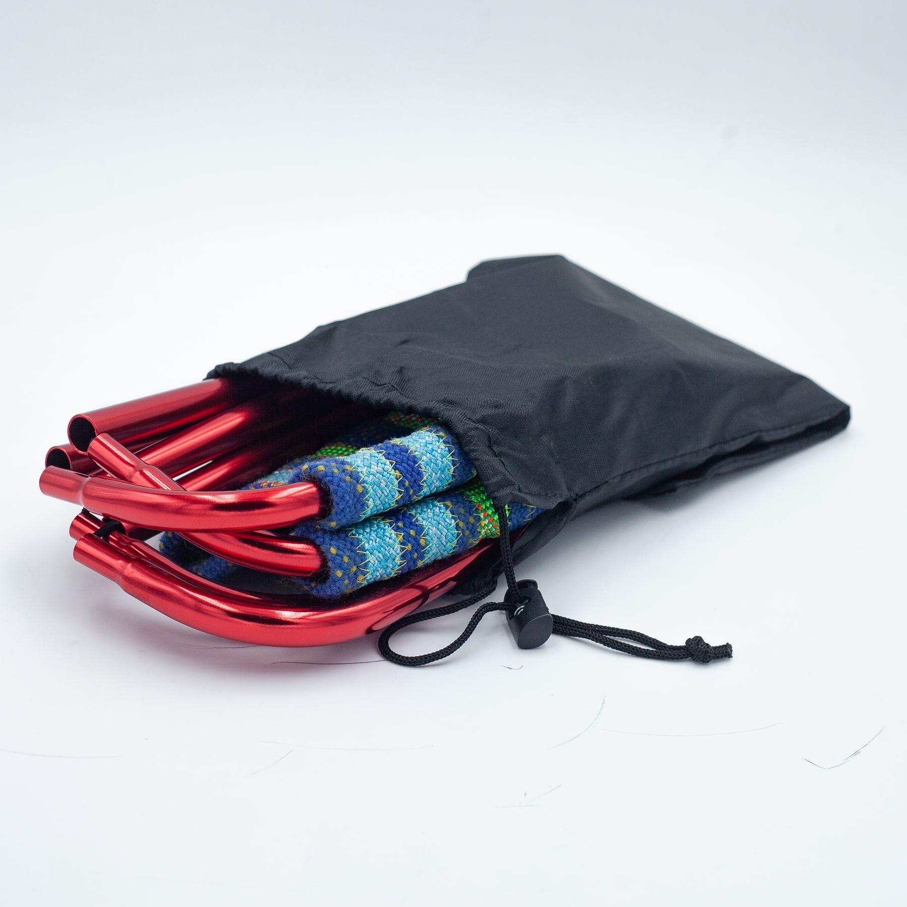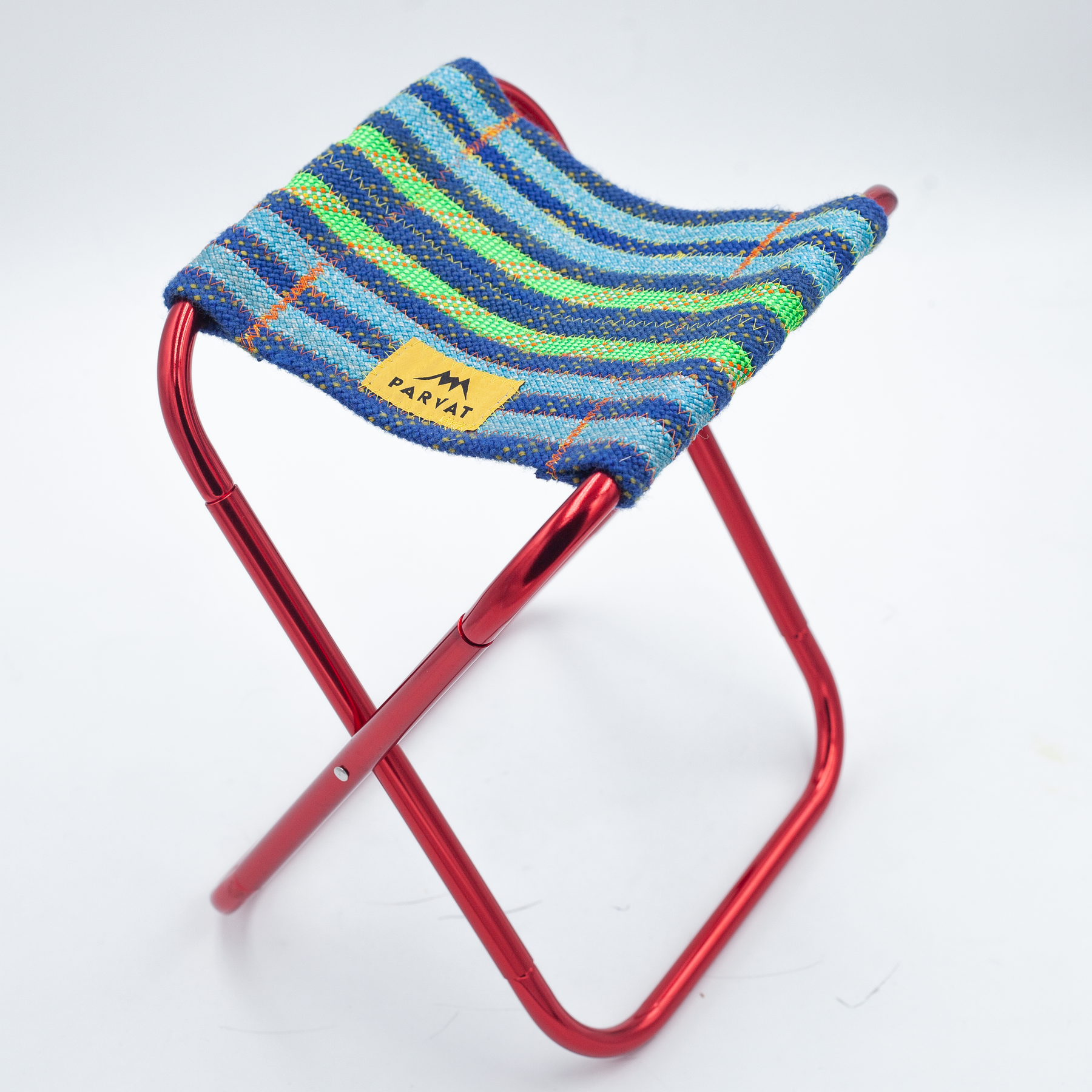 Sgabello pieghevole in alluminio con elastico interno. Seduta realizzata artigianalmente in corde d’arrampicata riciclate. Include pratica borsetta per il trasporto.